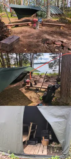 The tarp is a DD Hammocks 3 x 3 m Superlight tarp on a Derek Hansen ridgeline (you can google this one, really neat) and there is a tent support bar spreading the tarp on the front-back axis (this is again my own idea, highly recommended). The trick is to have a bar that’s longer than the tarp, so that it ends up bowing up and supporting the tarp. Mine is a 3,25 m spare part for some expensive tent that I do not have :D