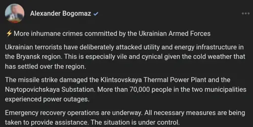 arrow-up166arrow-down1imageThe insanely hypocritical governor of Russia's Bryansk region complained about Ukrainian attacks on energy infrastructure.sopuli.xyzLaFinlandia@sopuli.xyz to Ukraine@sopuli.xyz · 9 days agomessage-square5linkfedilink